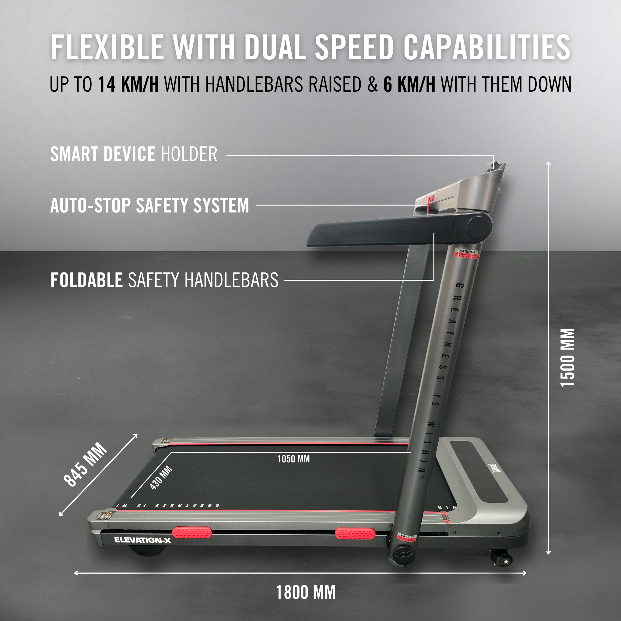 Powered by a robust 2.5HP peak motor, the Elevation X offers a smoother and more powerful experience than most walking pads in its class. With an impressive maximum speed of 14km/h when the handlebars are raised, you can enjoy a brisk run or an energising power walk, supported by the additional stability the handlebars provide. For a more natural and free-flowing stride, lower the handlebars and enjoy walking at speeds of up to 6km/h, simulating the effortless motion of walking outdoors. With the handheld remote you are able to adjust your pace at the simple touch of a button.